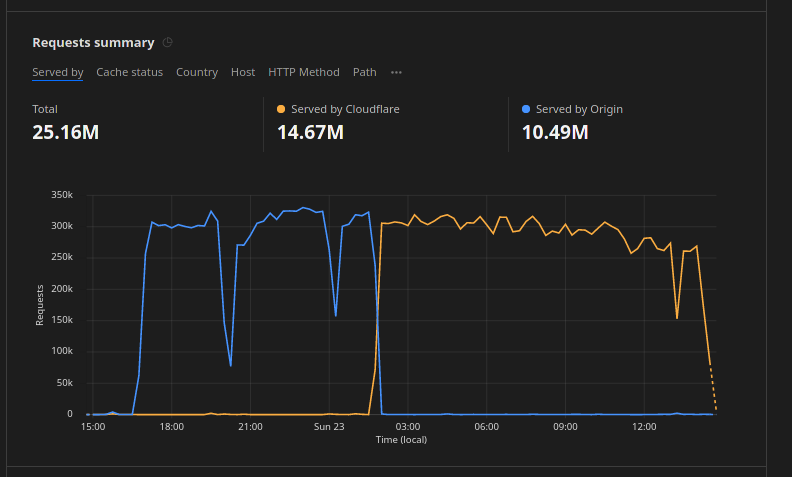 So first thing I do was check Cloudflare logs, see what traffic is going trough and see if Cloudflare was blocking it. Turns out 99% of the traffic is going pass Cloudflare and straight into the Server, no shit it was dying.